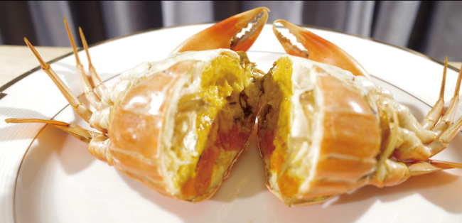 黃油相融,難分彼此。油膏浸滿整只蟹身,腹肉、蟹腿、蟹螯,甚至蟹腮,全身都金黃透光。細細品嘗,渾身散發一股霸道的鮮甜,是普通青蟹的10余倍,簡直就是“人間尤物”。